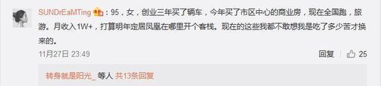 95年,創(chuàng)業(yè)三年買了輛車,今年買了市區(qū)中心的商業(yè)房,現(xiàn)在全國排,旅游。月收入一萬+,打算明年定居鳳凰哪里開個(gè)客棧,現(xiàn)在的著寫我都不敢想我是吃了多少苦才換來的。