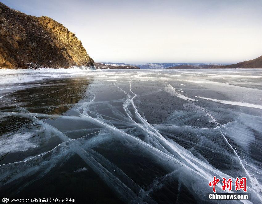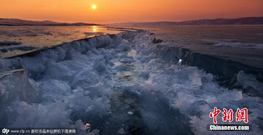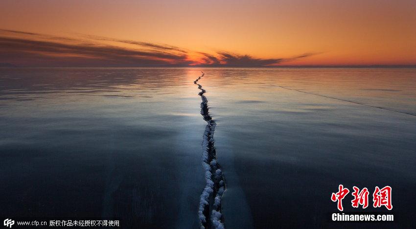 2015年4月1日消息,俄羅斯貝加爾湖面結(jié)冰,數(shù)百米長(zhǎng)的裂縫仿佛將世界一分為二,夕陽的余暉灑在湖面上景色神奇迷人。