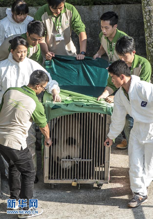 4月30日,工作人員將大熊貓運(yùn)送到澳門路環(huán)金像農(nóng)場(chǎng)的隔離設(shè)施地點(diǎn)。當(dāng)日16時(shí)許,中央政府贈(zèng)送澳門的新一對(duì)大熊貓運(yùn)抵澳門,澳門特區(qū)政府行政法務(wù)司司長(zhǎng)陳海帆等官員及部分少年兒童在機(jī)場(chǎng)迎接。大熊貓經(jīng)檢疫人員檢查后在運(yùn)輸籠中向前來接機(jī)的人們短暫亮相。目前它們身體狀況良好,隨后將前往金像農(nóng)場(chǎng)進(jìn)行30天隔離檢疫。新華社記者張金加攝