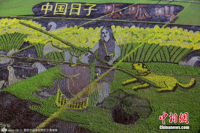 2015年6月22日,遼寧省沈陽市,總占地面積150畝的巨幅稻田畫《中國(guó)日子 呱呱叫》、《中國(guó)夢(mèng) 幸福起航》、《小夢(mèng)露》等十三幅“3D稻田畫”正式亮相沈陽沈北新區(qū)興隆臺(tái)錫伯族鎮(zhèn)。據(jù)了解,錫伯族有種植稻田畫祈福的傳統(tǒng),稻田畫先設(shè)計(jì)好要表現(xiàn)的圖形,利用先進(jìn)的3D技術(shù)和透視技術(shù),用矢量法定點(diǎn)定樁連線人工填色,種植不同品種有著不同顏色葉子的水稻,繪制出平面,立體,嘍空,線條四種不同風(fēng)格稻田畫。田衛(wèi)濤 攝 圖片來源:CFP視覺中國(guó)