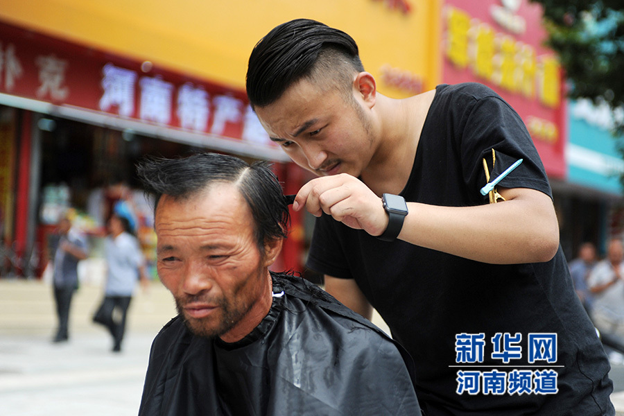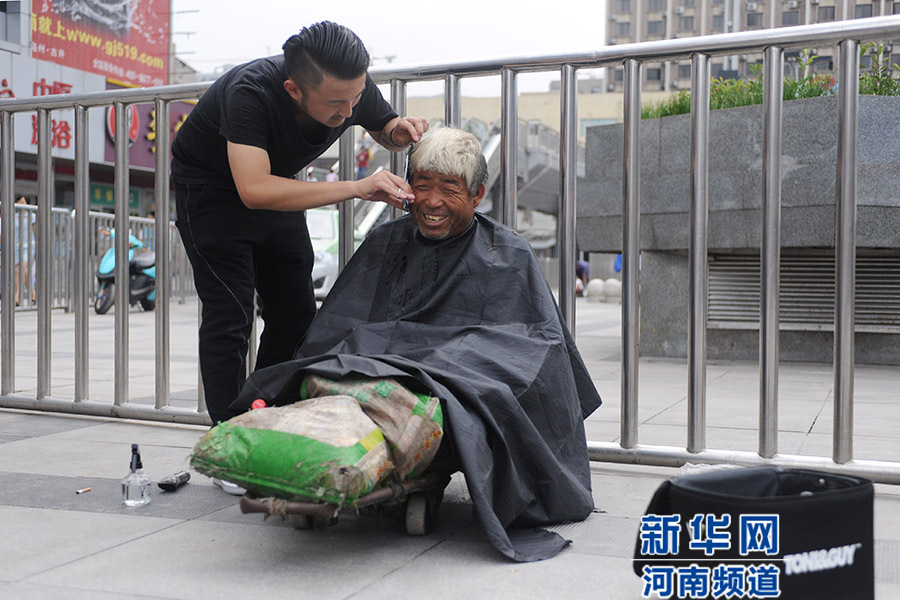 從7月21日開始,一位名叫紅濤的理發(fā)師每逢周二在鄭州街頭免費(fèi)為流浪人員理發(fā),他希望用此項行動呼吁大家關(guān)注街頭流浪人員群體。紅濤說,他還打算免費(fèi)為農(nóng)民工等群體理發(fā),讓他們感受到社會的溫暖。新華社發(fā)(馮大鵬 攝)