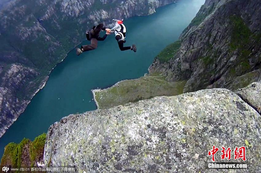 挪威Lysebotn,羅伯塔·曼奇諾和諾亞·巴恩森從高3500英尺(約合1066米)的懸崖上跳傘后在空中接吻。 圖片來(lái)源:CFP視覺中國(guó)