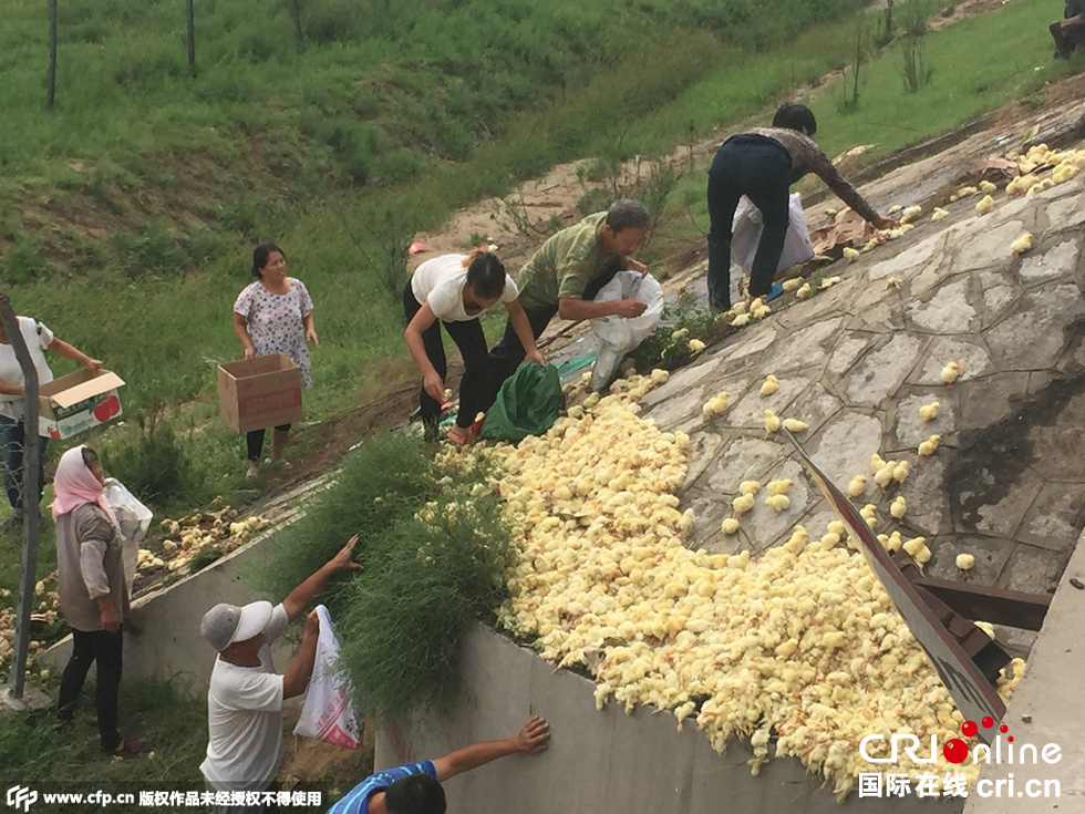 8月25日中午,山東榮烏高速濱州沾化區(qū)段,一輛山東禽類運輸車輛傾翻,車上裝有數(shù)萬只小雞。無數(shù)小雞散落在路上和高速護坡上,死的死傷的傷,大多數(shù)存活。