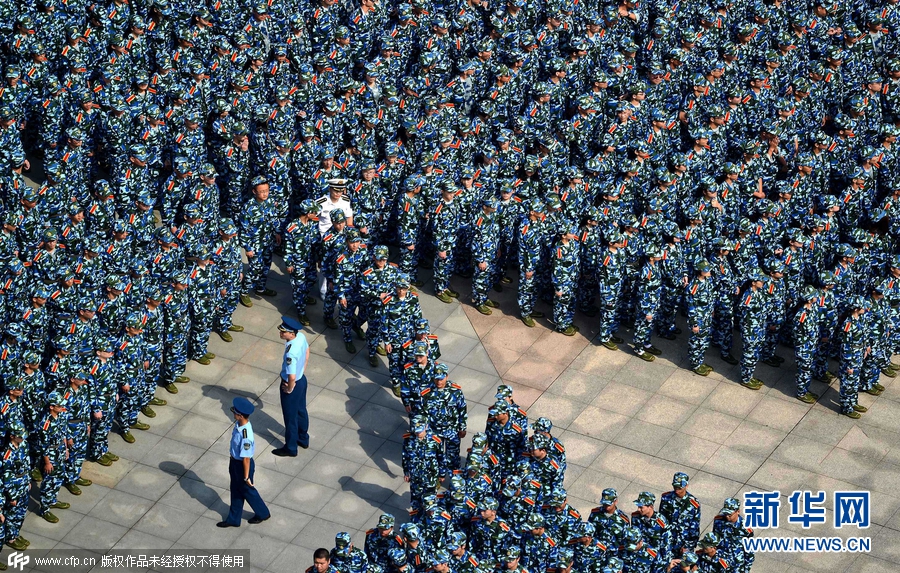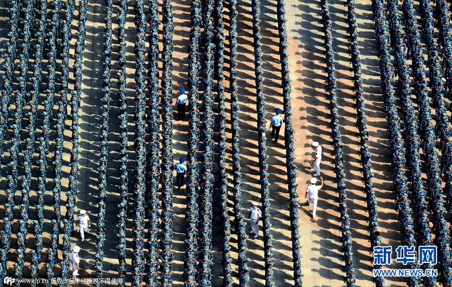 2015年9月14日,湖北武漢,當日上午,武漢理工大學2015級本科生開學典禮暨軍訓動員大會在該校南湖校區(qū)舉行,全校多個校區(qū)約9000名新生身著迷彩戎裝一起進行軍訓,場面震撼壯觀。南湖校區(qū)現(xiàn)場集合了約7000名新生參與軍訓,隊列整齊、英姿颯爽,熱情投入軍訓,開啟了朝氣蓬勃的大學新生活。圖片來源:cfp