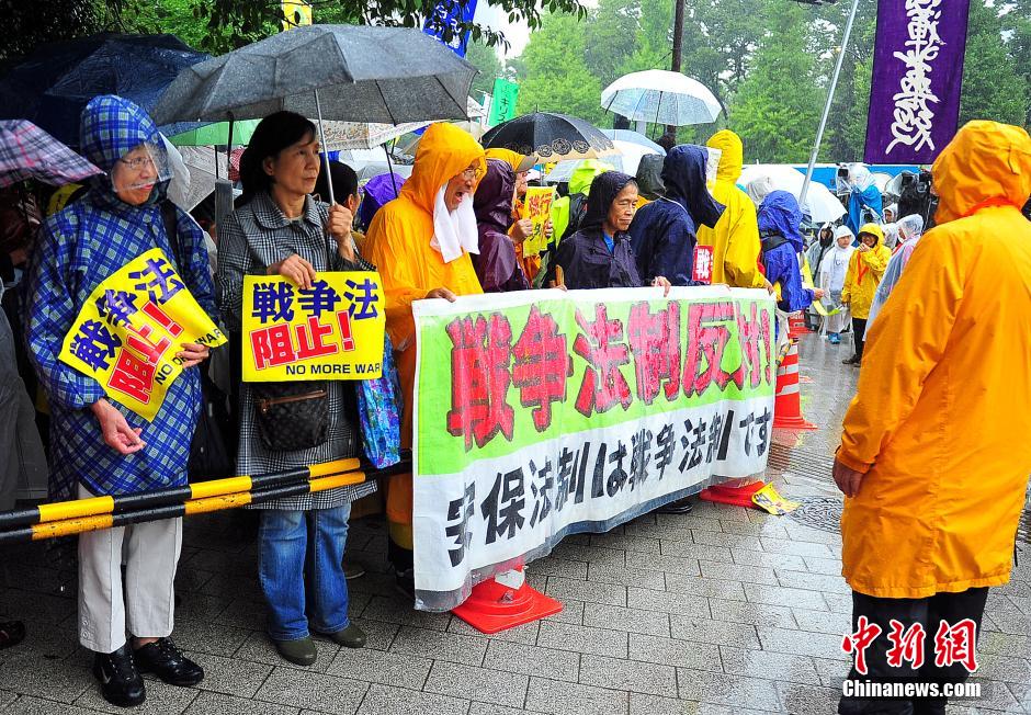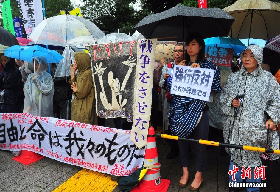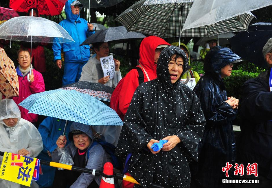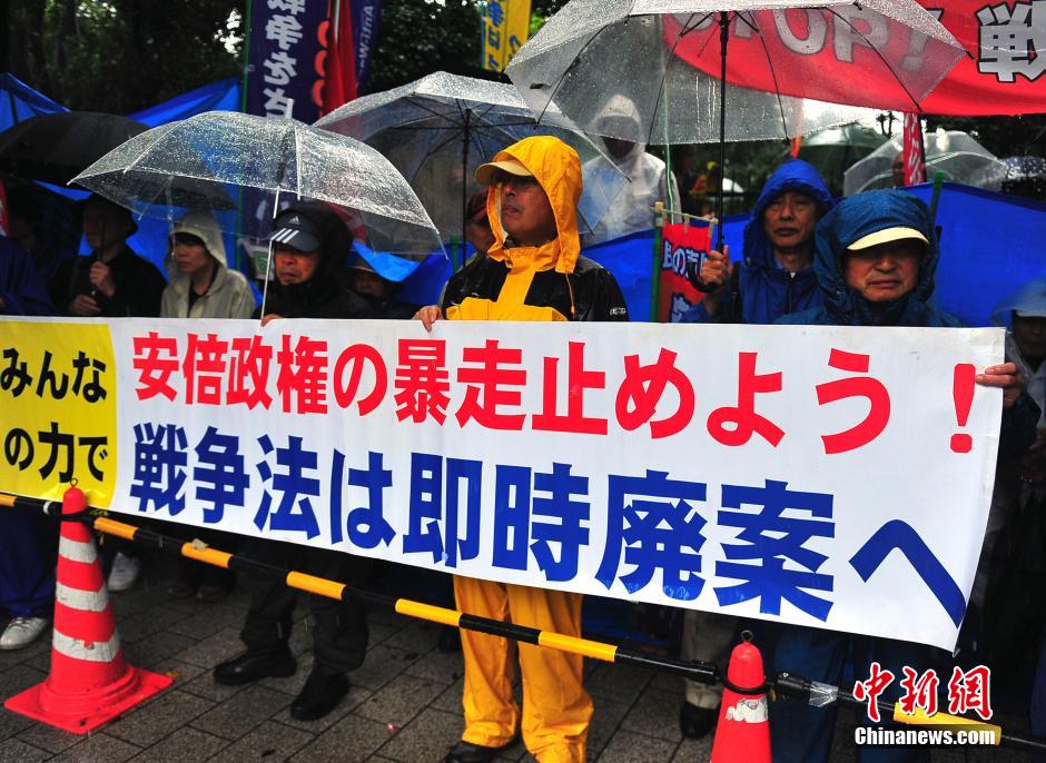 隨著安倍陣營(yíng)強(qiáng)推以解禁集體自衛(wèi)權(quán)為核心內(nèi)容的安保法案最終過關(guān)的計(jì)劃進(jìn)入“倒計(jì)時(shí)”,日本民眾的反安??棺h活動(dòng)再度進(jìn)入高潮。在之前徹夜抗議之后,9月17日白天,又有眾多日本民眾冒著大雨持續(xù)聚集在國(guó)會(huì)周邊進(jìn)行抗議活動(dòng)。中新社發(fā) 王健 攝