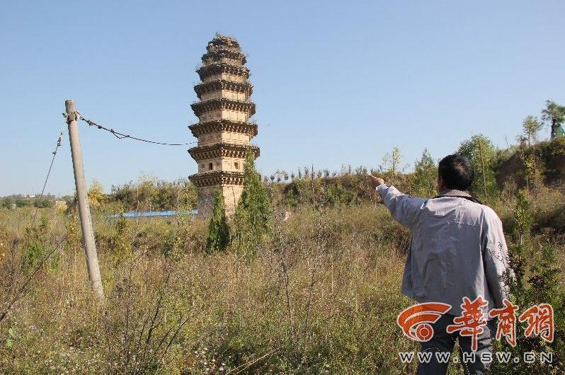 12日,住在離塔不遠(yuǎn)處的村民趙先生告訴華商報(bào)記者,在他的印象中,這座塔發(fā)生傾斜已經(jīng)有20多年了,大約在2005年前后。銅川新區(qū)管委會(huì)的工作人員在塔身上系上了一根鋼索,目的是為防止塔身繼續(xù)傾斜?!摆s緊把這塔保護(hù)一下,再不保護(hù)這塔可能就沒有了?!壁w先生說,除了傾斜、風(fēng)蝕,導(dǎo)致塔體破壞外,偶爾還有盜墓賊光顧,他們?cè)谒車蛄撕脦讉€(gè)盜洞,這也加速了塔的破壞。