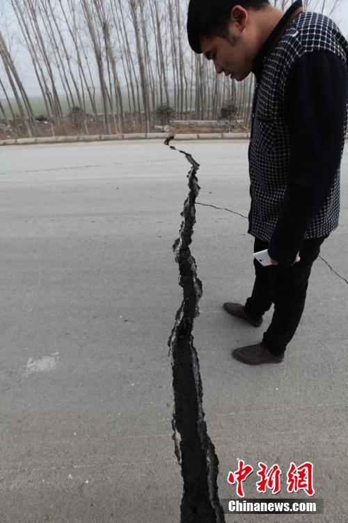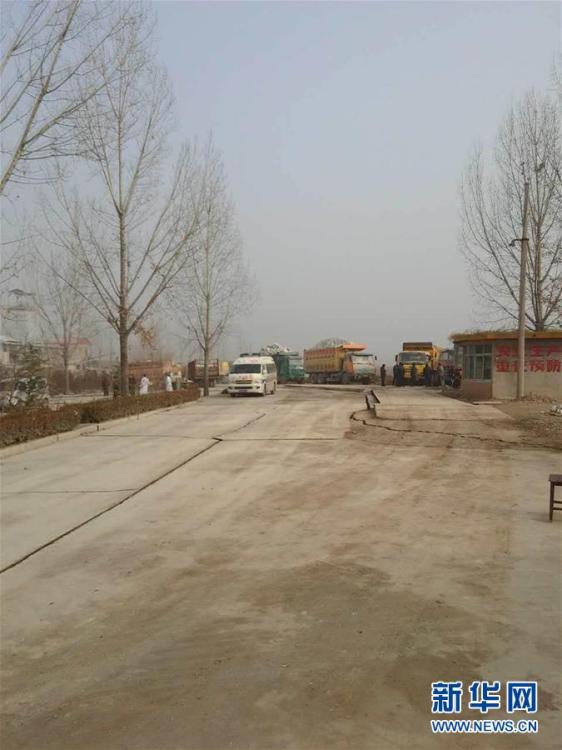 12月25日,山東平邑,位于平邑縣保太鎮(zhèn)的玉榮商貿(mào)有限公司石膏礦發(fā)生坍塌事故。圖為因塌陷開(kāi)裂的道路。視覺(jué)中國(guó)供圖