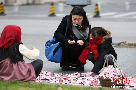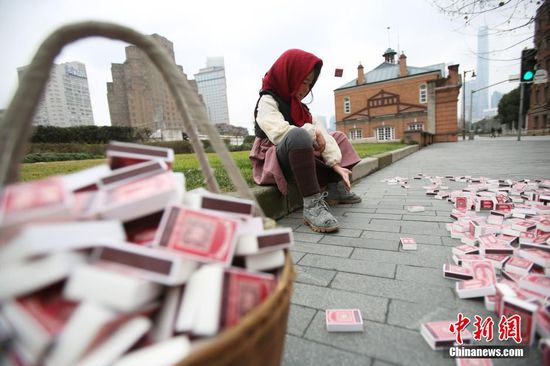 1月12日,上海外灘街頭出現(xiàn)一位小女孩,她身穿古典長裙,頭裹赭紅色圍巾,挎著裝滿火柴的小竹籃,在寒風(fēng)中向過往的路人送小火柴。據(jù)了解,這是一次“愛心衣櫥”幫助中國山區(qū)孩子擺脫寒冷的愛心募捐活動。在寒冷的冬天,他們嘗試以“賣火柴的小女孩”活動,喚起社會的關(guān)注,把更多的溫暖傳遞到中國山區(qū)寒冷孩子的手上。只要掃一掃火柴盒上的二維碼,就可以立刻向山區(qū)孩子送上一套溫暖新衣。張亨偉 攝