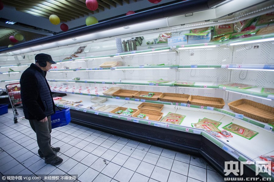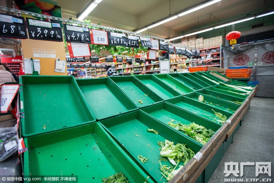 2016年1月20日,浙江省杭州市,杭州市氣象臺發(fā)布暴雪黃色預(yù)警信號。寒潮將至,市民紛紛囤積食品,眾多貨架被一搶而空。