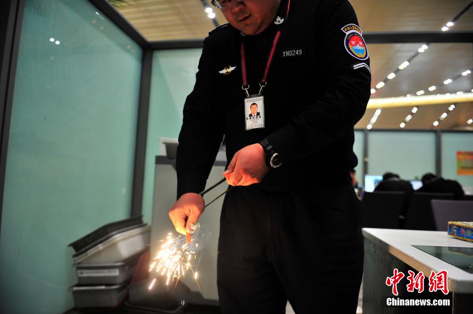 2月5日,工作人員展示查獲的引火鎂棒。當(dāng)日,昆明長(zhǎng)水國(guó)際機(jī)場(chǎng)安檢站工作人員,向記者展示春運(yùn)開(kāi)始13天以來(lái),查堵下的如皮帶扣打火機(jī)、iPhone造型打火機(jī)、手表打火機(jī)、煙花爆竹、子彈等各種奇葩違禁物品。中新社記者 劉冉陽(yáng) 攝