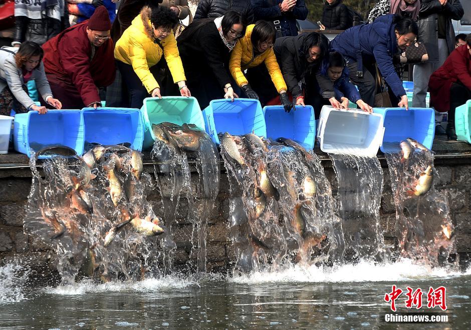 2016年2月22日,山東省濟(jì)南市,眾多市民來到大明湖南岸,以每斤4.5元的價(jià)格購買鯉魚和鯽魚,集體將魚兒放生到大明湖,千余尾魚兒同時(shí)傾倒在湖中,場面頗為壯觀。