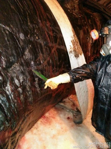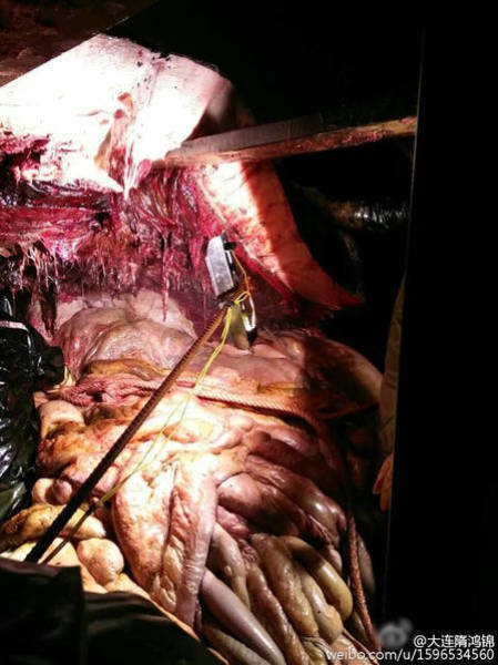2016年2月14日至15日,江蘇如東洋口港海灘先后發(fā)現(xiàn)兩條抹香鯨擱淺死亡。19日,技術(shù)專家開始抹香鯨的開腹工作,其中一位專家進入了抹香鯨的體內(nèi),在工作之時拍下了體內(nèi)的情況。