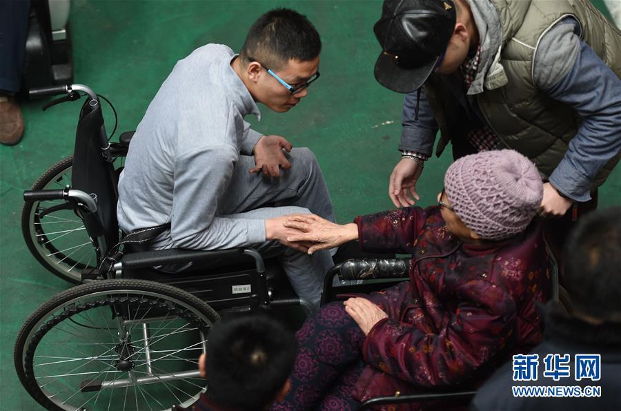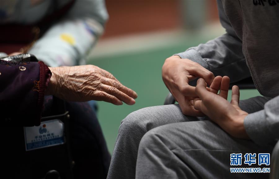 3月17日,奶奶與黃舸扮演者王峰見面后,伸出手準備觸碰王峰的手,而王峰則保持著模仿肌營養(yǎng)不良患者的手型。新華社記者 李尕 攝 圖片來源:新華網