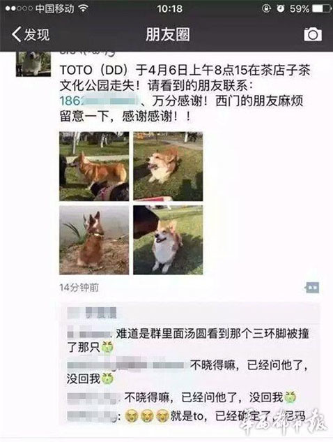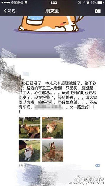 據(jù)主人李女士講述,“早上8點20分左右,我媽媽帶狗出去散步,它跟著別的狗跑丟了。我們找了很久?!崩钆空f,小狗跑丟后,在成都一愛寵微信群里,有群友稱在三環(huán)路上看到過它,“說是它橫穿三環(huán)路,把后腿撞到了,它就沿著三環(huán)路跑了。”圖為李女士在朋友圈發(fā)布的尋狗信息。
