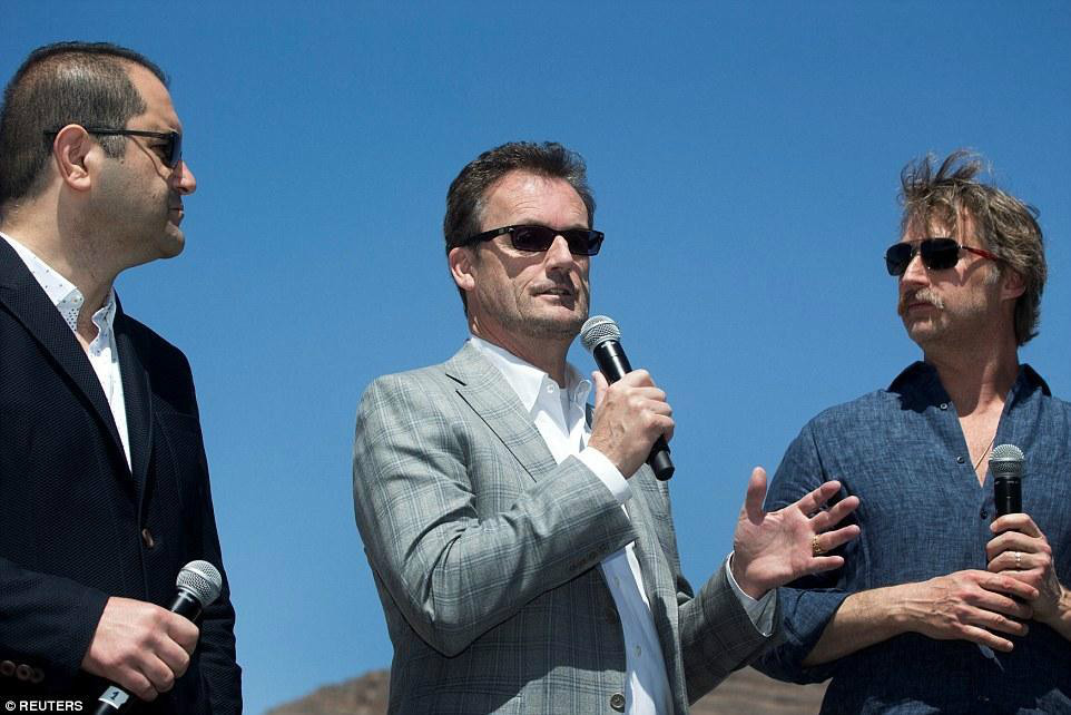 圖中間是Hyperloop One公司CEO羅布-勞埃德,左右兩邊分別是Hyperloop One公司創(chuàng)始人舍文-皮許瓦爾和布羅根-班布羅根。他們在北拉斯維加斯超級高鐵推進(jìn)系統(tǒng)測試之后發(fā)表了講話。