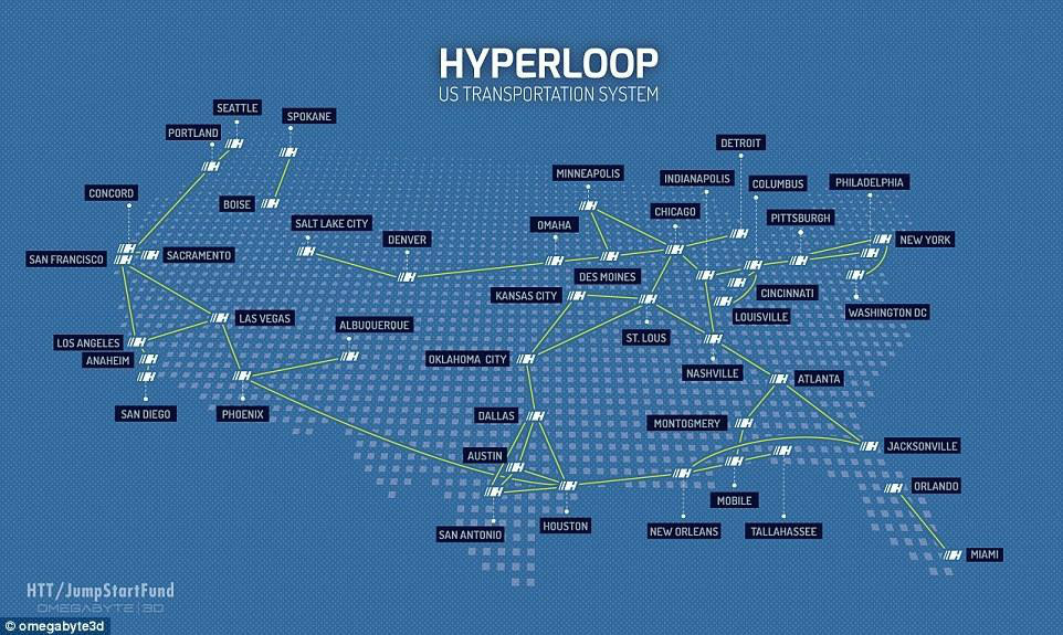 馬斯克在提出超級高鐵概念時(shí)曾說它是協(xié)和式超音速噴射客機(jī)、軌道炮和空氣球臺的交叉結(jié)合,圖為HTT公司想架設(shè)超級高鐵的地區(qū)路線圖。