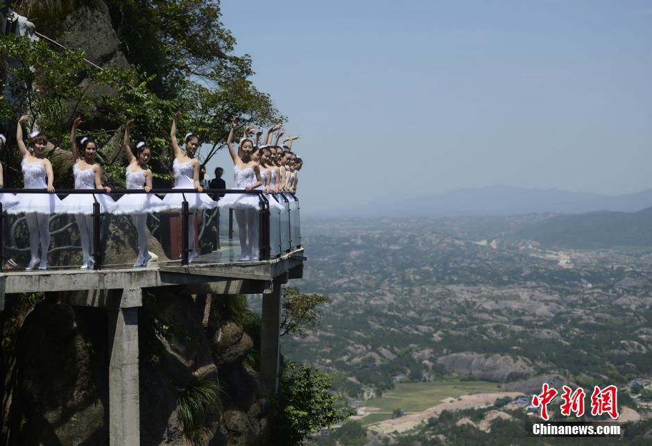 5月16日,眾多身著芭蕾舞服的舞蹈愛好者來到湖南平江石牛寨,在音樂玻璃棧道和懸崖邊跳起了芭蕾,高難度的舞姿吸引了眾多游客圍觀。 楊華峰 攝