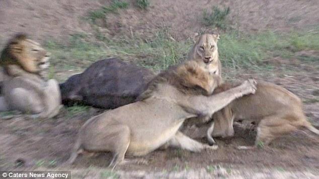 這次攻擊造成了一發(fā)不可收拾的局面,兩群獅子開(kāi)始互毆決定誰(shuí)先吃掉可憐的水牛。