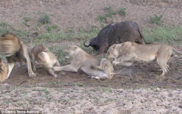 突然,兩群獅子開(kāi)始內(nèi)訌,一只母獅子攻擊了一只不屬于自己群體的公獅子,試圖阻止它享用水牛。