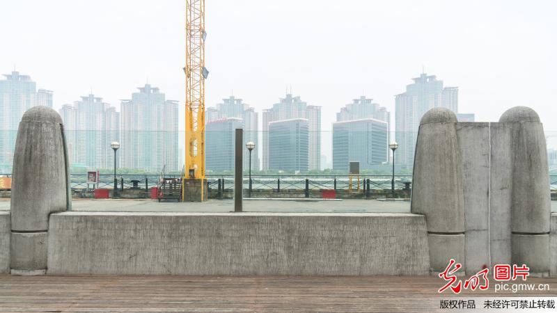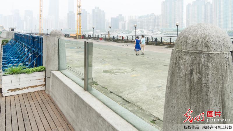 當(dāng)日中午,走訪南外灘老碼頭,見(jiàn)到這一長(zhǎng)達(dá)數(shù)十米,由鋼筋混凝土墻體和通透式玻璃組合而成的"抗洪神器",其中雙層玻璃防汛墻的厚度達(dá)到18毫米,既滿足防汛擋水需要,同時(shí)方便游客坐在岸堤邊欣賞老碼頭和江岸景色。(王岡攝/光明圖片)