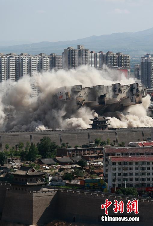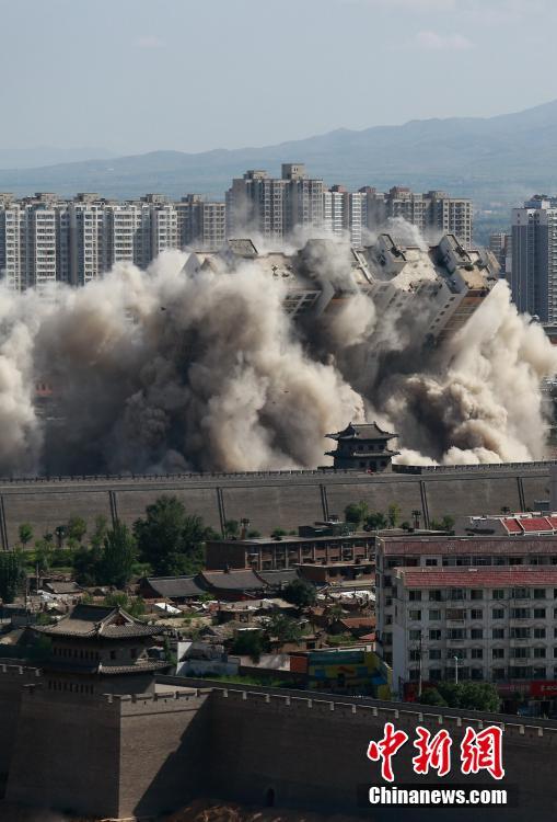 8月8日,山西大同,當(dāng)?shù)卣畬ξ挥诒背菈ξ涠ㄎ鏖T外的一座90米高的大樓實施爆破拆除,飛揚的塵土與古城墻呼應(yīng)形成壯觀場面。由于該樓位置與古城保護規(guī)劃有所沖突,當(dāng)?shù)卣畬ζ鋵嵤┍?,以此加快古城的保護與復(fù)興。 楊榮 攝