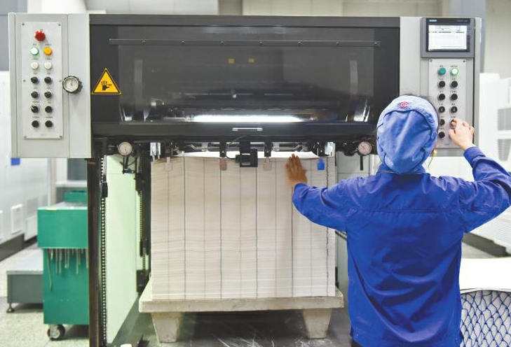 成鈔公司大門口,緊握槍支的武警駐守,在這里,有著嚴密的安檢措施。在經(jīng)過層層申報審批,暫存隨身攜帶的手包和手機后,記者獲批進入生產(chǎn)車間。瞬間,靜謐被機器的轟鳴代替。在車間內(nèi),穿著藍色工裝的工人正有序忙碌著。在這里經(jīng)過多道印鈔工序及干燥、檢驗等環(huán)節(jié)后,一張張雪白的印鈔紙“搖身一變”,成為紅紅綠綠的鈔票,整個過程前后需要耗時1個月左右。