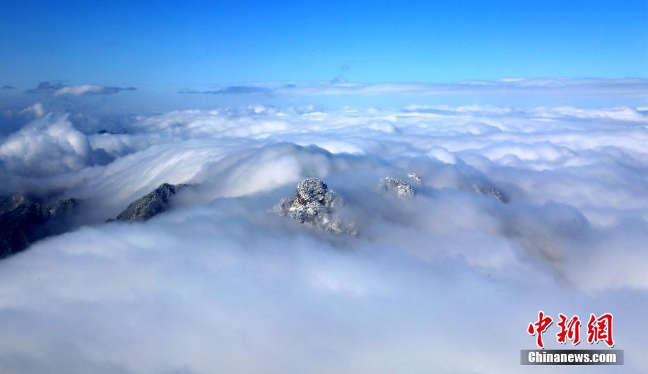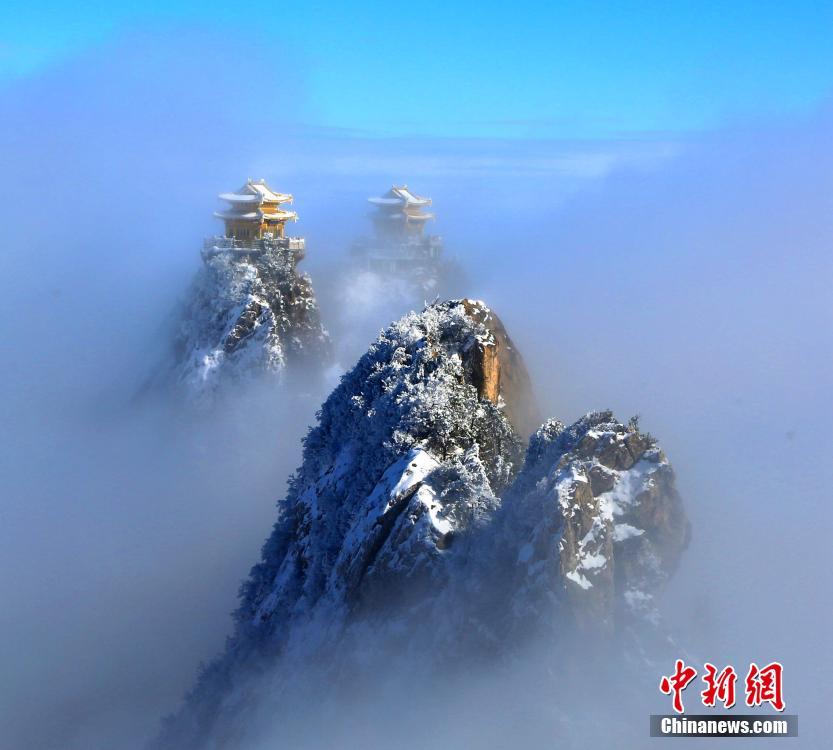1月7日,連續(xù)降雪之后,位于河南洛陽的道教圣地老君山雪后初晴,海拔2000米的伏牛山主峰上,白雪皚皚、銀裝素裹,加之云海浮現(xiàn)與藍(lán)天白云交相輝映,絕壁道觀似瓊樓玉宇幻如仙境美不勝收。圖為云海波濤洶涌,“淹沒”山頂。王中舉 攝