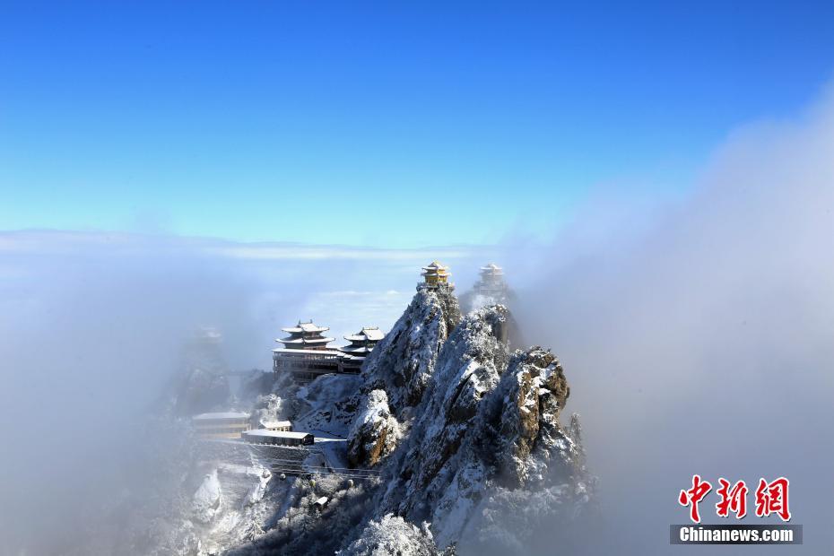 1月7日,連續(xù)降雪之后,位于河南洛陽的道教圣地老君山雪后初晴,海拔2000米的伏牛山主峰上,白雪皚皚、銀裝素裹,加之云海浮現(xiàn)與藍(lán)天白云交相輝映,絕壁道觀似瓊樓玉宇幻如仙境美不勝收。 圖為海拔2000米的絕壁道觀幻如仙境。王中舉 攝