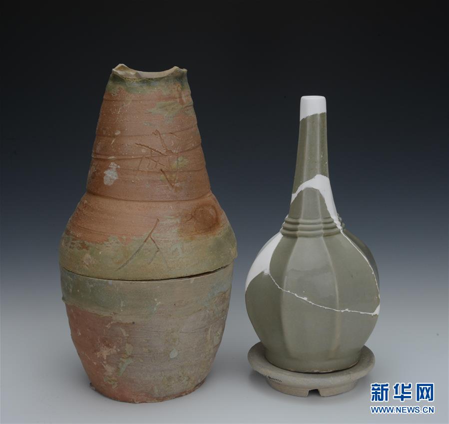 這是浙江慈溪上林湖后司岙唐五代秘色瓷窯址出土的秘色瓷凈瓶和裝燒匣缽(資料照片)。