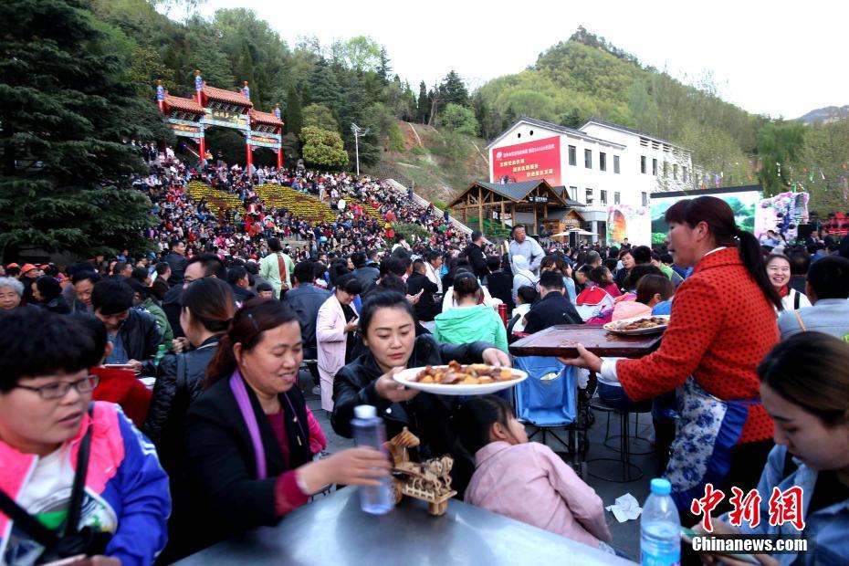 4月22日晚,河南欒川雞冠洞高山牡丹節(jié)開幕,特地舉辦千人牡丹宴,當?shù)氐奶厣珯璐ǘ垢?、樹芽菜以及主菜牡丹燕菜紛紛上桌,吸引上千民眾品嘗,場面壯觀。 中新社記者 王中舉 攝
