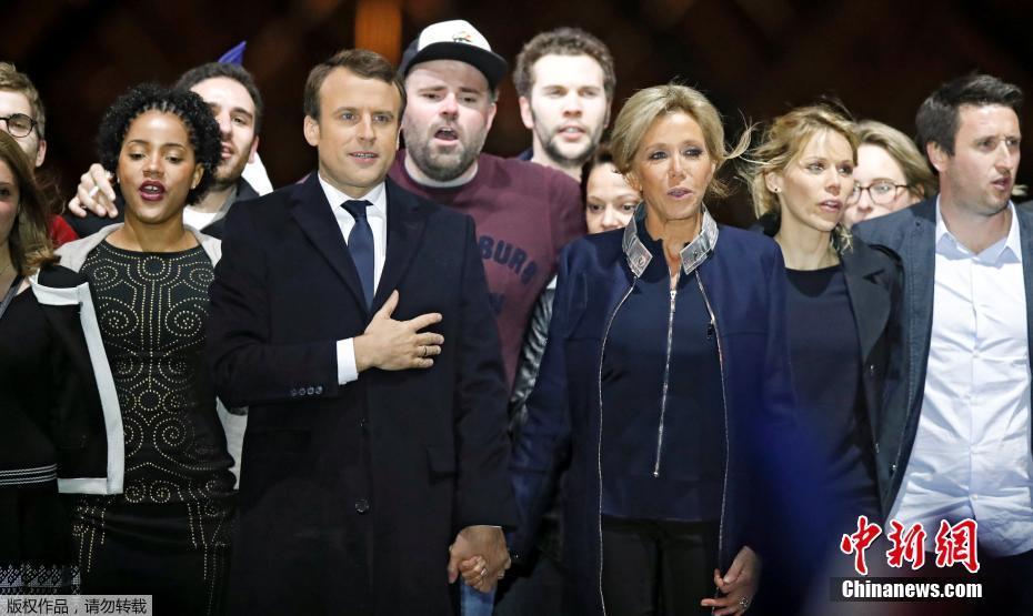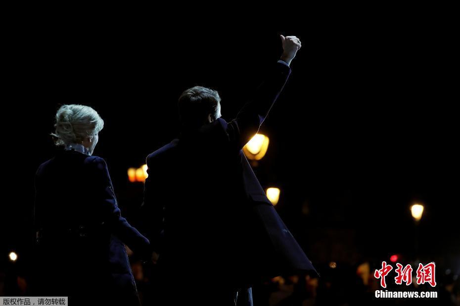 巴黎時間5月7日晚,法國總統(tǒng)選舉第二輪投票初步計票結(jié)果顯示,中間派獨(dú)立候選人、“前進(jìn)”運(yùn)動領(lǐng)導(dǎo)人埃馬紐埃爾·馬克龍以大幅優(yōu)勢擊敗極右翼政黨“國民陣線”候選人馬麗娜·勒龐。年僅39歲的馬克龍由此成為法國史上最年輕的總統(tǒng),也成為世界上最年輕的大國領(lǐng)導(dǎo)人。圖為馬克龍(左二)和妻子布麗吉特(右二)在慶祝勝選的集會上向支持者致意。中新社記者 龍劍武 攝