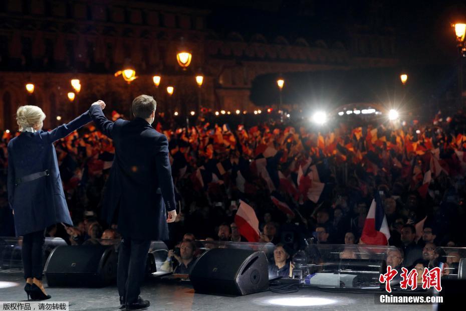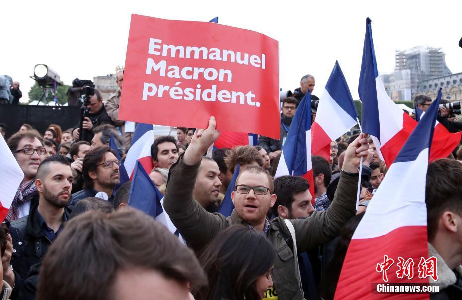 巴黎時間5月7日晚,法國總統(tǒng)選舉第二輪投票初步計票結(jié)果顯示,中間派獨(dú)立候選人、“前進(jìn)”運(yùn)動領(lǐng)導(dǎo)人埃馬紐埃爾·馬克龍以大幅優(yōu)勢擊敗極右翼政黨“國民陣線”候選人馬麗娜·勒龐。年僅39歲的馬克龍由此成為法國史上最年輕的總統(tǒng),也成為世界上最年輕的大國領(lǐng)導(dǎo)人。圖為馬克龍的支持者在得知馬克龍當(dāng)選后歡呼。中新社記者 龍劍武 攝