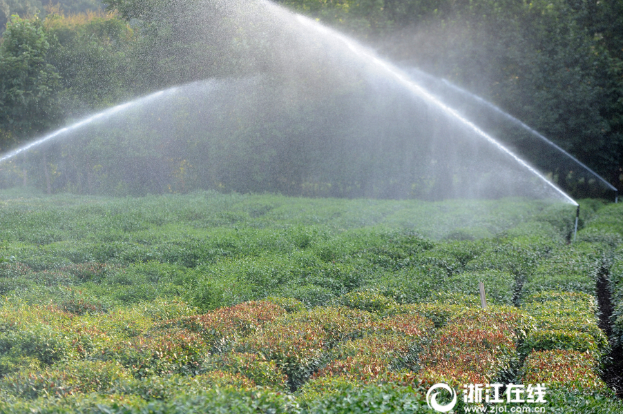 7月27日傍晚,杭州西湖區(qū)雙峰村龍井茶園,全自動(dòng)噴灌系統(tǒng)在為“曬傷”的茶樹澆水。