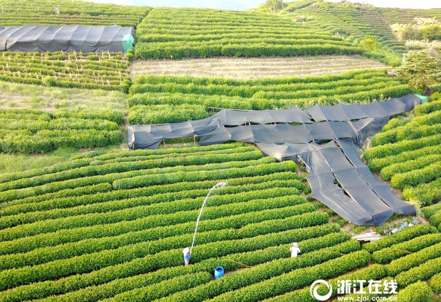 連日來,杭城持續(xù)高溫?zé)o雨,西湖龍井茶一級(jí)保護(hù)區(qū)的梅家塢村、梵村、雙峰村等地茶樹“受傷”不輕。茶農(nóng)們積極行動(dòng)起來,為茶樹蓋上防曬網(wǎng),同時(shí)采取澆水的方式抗旱保茶。(浙江在線記者 吳元峰 董旭明 攝)