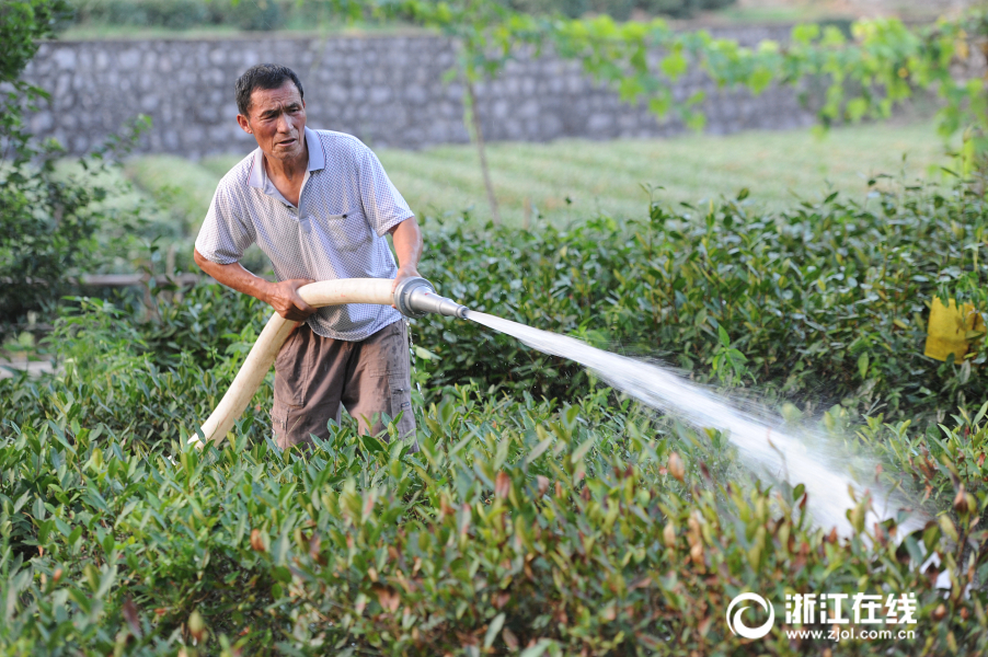7月27日,熱浪滾滾,杭州西湖區(qū)梵村茶農(nóng)在自家茶園里,用高壓水槍為“受傷”的茶樹澆水。