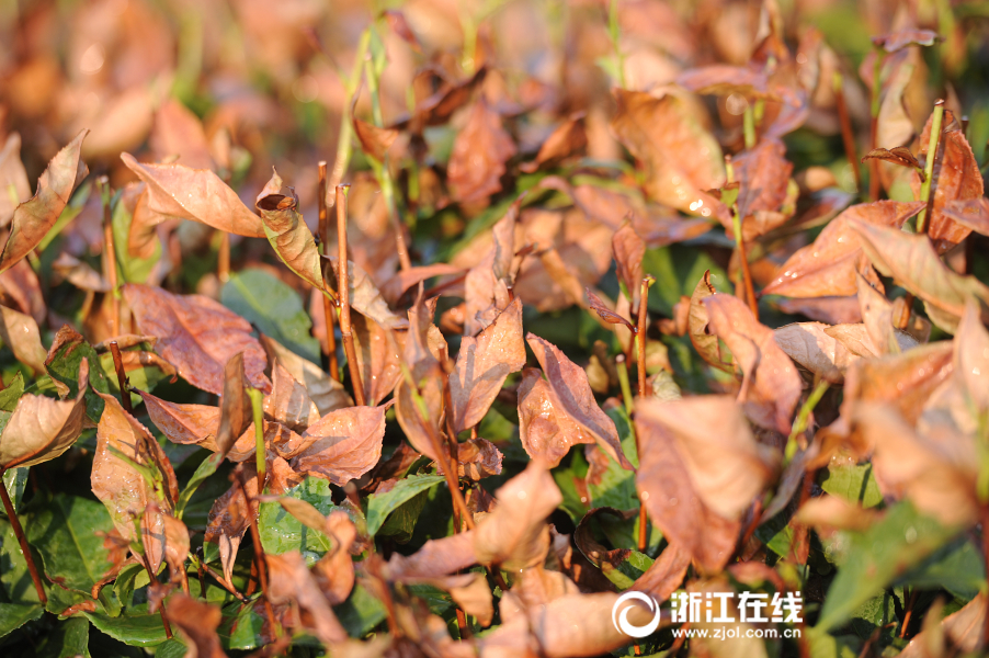 7月27日,熱浪滾滾,杭州西湖區(qū)梵村,龍井茶樹被太陽烤成焦葉狀。