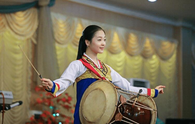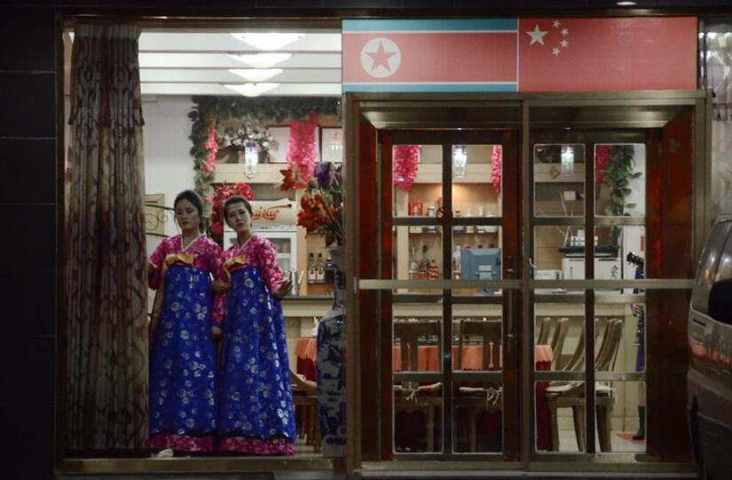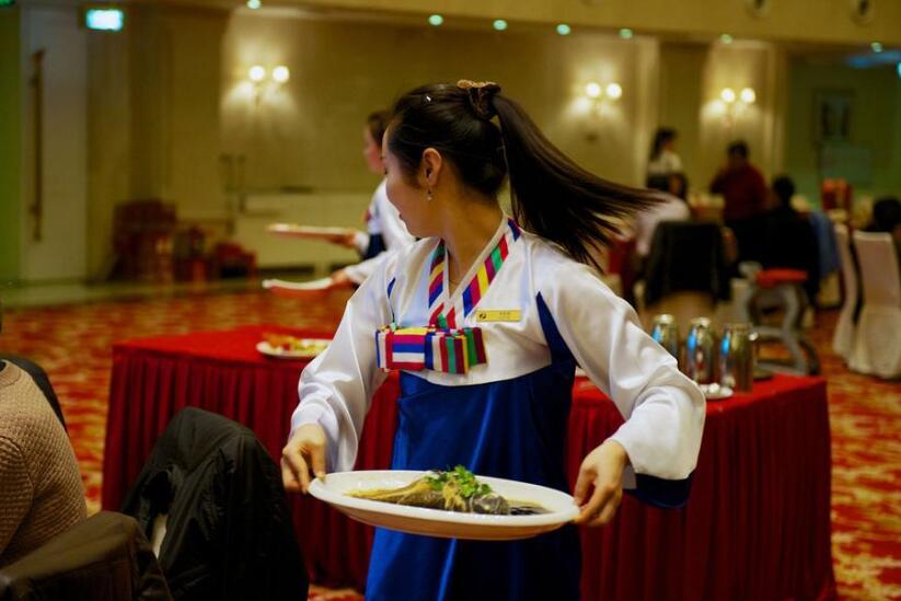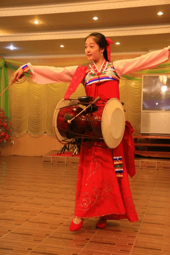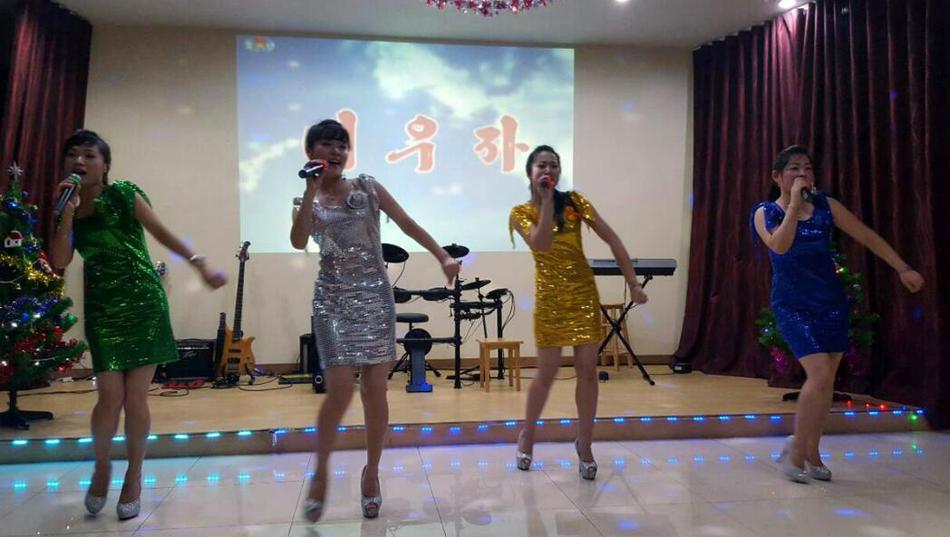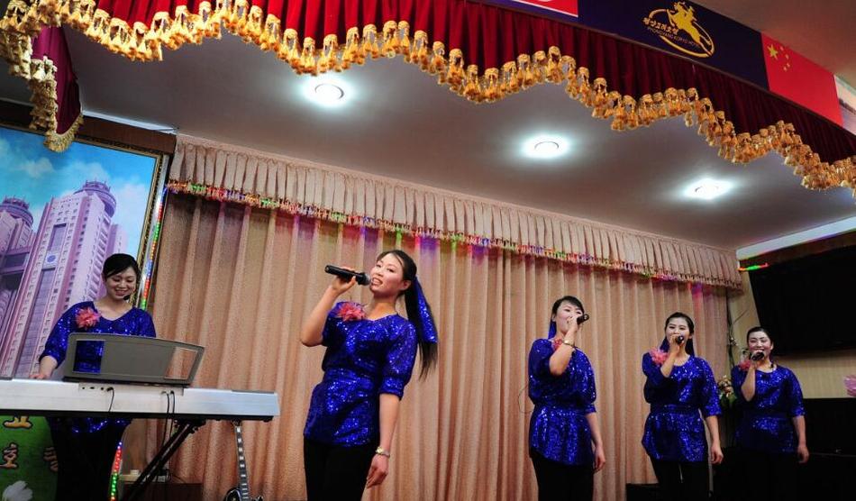 朝鮮餐廳的服務(wù)員在表演歌舞。