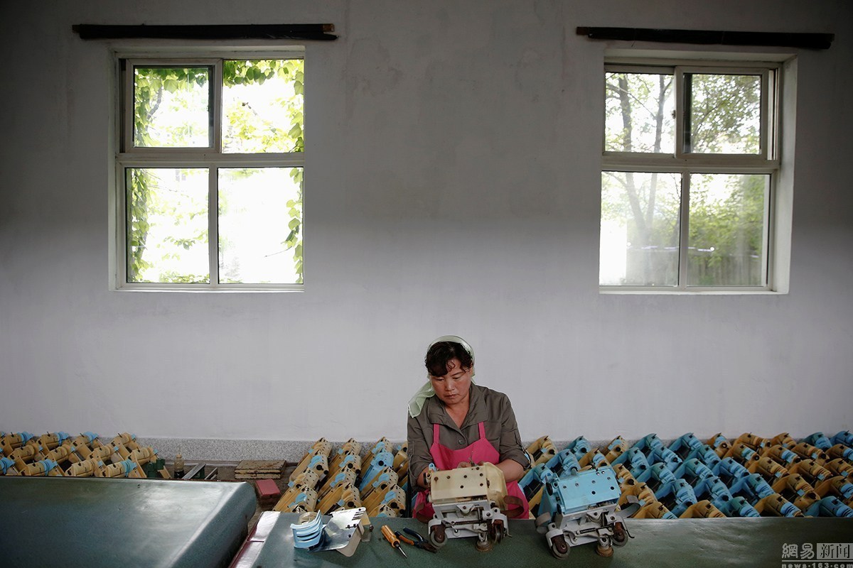 在丹東郊區(qū)的一個臨時工廠里,一位朝鮮女工正在做足球鞋。