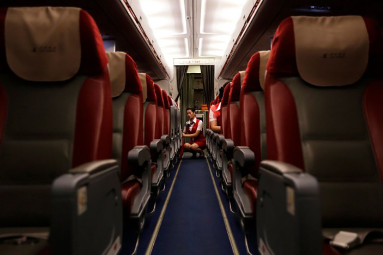 朝鮮高麗航空的空姐正在查看從北京飛到平壤的飛機。