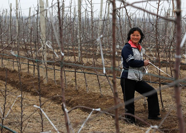一位女工面帶微笑地站在她工作的Daedonggang水果農(nóng)場。