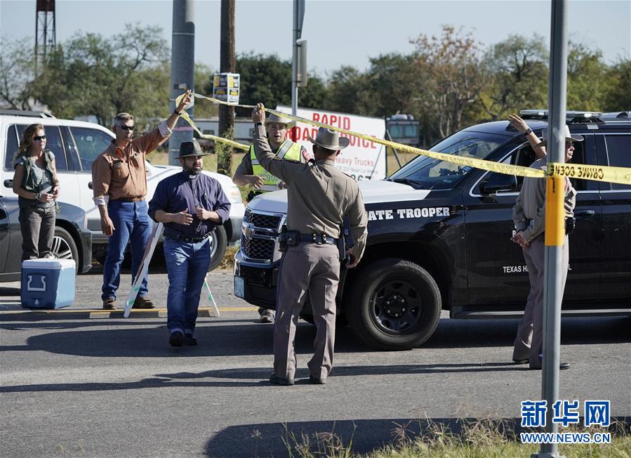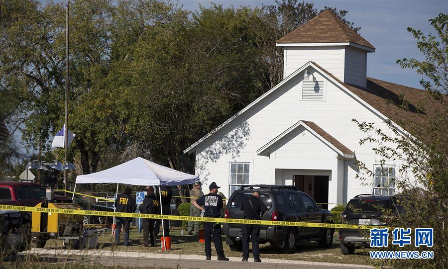 11月5日,在美國得克薩斯州南部薩瑟蘭斯普林斯鎮(zhèn),執(zhí)法人員在槍擊事件現(xiàn)場工作。美國得克薩斯州南部薩瑟蘭斯普林斯鎮(zhèn)一所教堂5日發(fā)生槍擊事件。警方向當(dāng)?shù)孛襟w證實,槍擊至少造成27人死亡、多人受傷。 新華社/美聯(lián)
