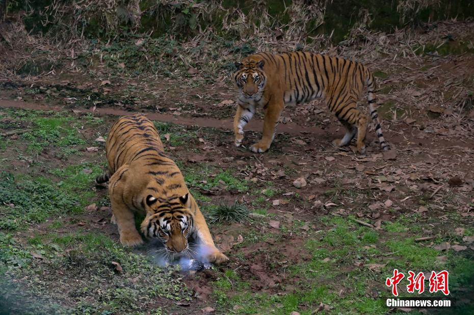 另一群老虎圍著電池打量,其中一只突然上前咬上一口,電池瞬間爆燃冒煙。王成杰 攝