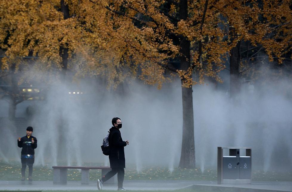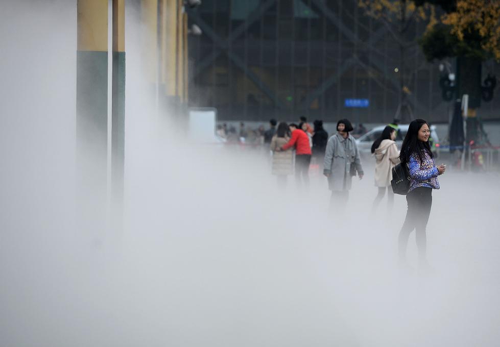 2017年12月23日,成都。天府廣場西側(cè)和南側(cè)有了新變化——上午10點,綠油油的草坪上空開始籠罩著層層白色霧氣,仿佛置身于仙境一般。走近一點,還有水霧襲來,平添一分清新和涼意。