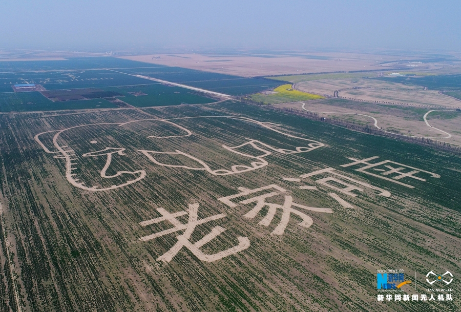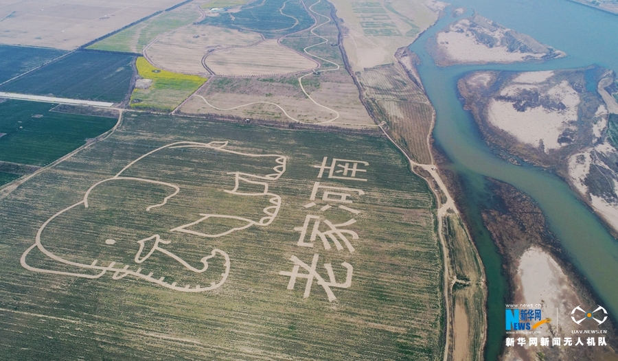 3月25日在黃河濕地豐樂大河牧業(yè)種植區(qū)航拍的巨幅農業(yè)創(chuàng)意圖《老家河南》。