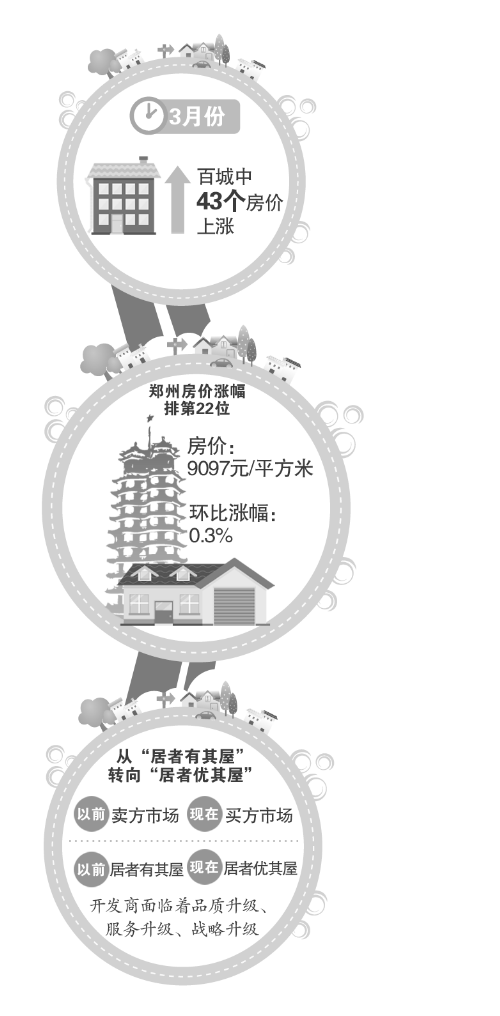 中國指數(shù)研究院昨日發(fā)布的百城房?jī)r(jià)指數(shù)顯示,3月份,100個(gè)城市中有43個(gè)房?jī)r(jià)上漲,全國房?jī)r(jià)環(huán)比整體跌幅收窄,微跌0.15%,同比跌幅繼續(xù)擴(kuò)大,下跌4.35%。其中,鄭州3月份新建商住房均價(jià)為9097元/平方米,環(huán)比上漲0.3%,漲幅在全國排到第22位。