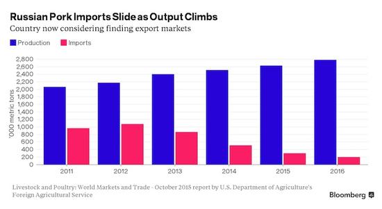 2014年烏克蘭危機(jī)爆發(fā)后,為回應(yīng)西方國家的制裁,俄羅斯宣布“全面禁止”從歐盟、美國及其它西方國家進(jìn)口豬肉等食物。與此同時,總統(tǒng)普京表示俄羅斯有潛力成為全世界食品生產(chǎn)的領(lǐng)軍者,并預(yù)計到2020年實現(xiàn)農(nóng)業(yè)自足。