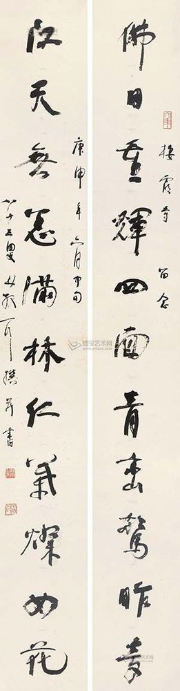 北京匡時(shí)國(guó)際拍賣(mài)有限公司描述稱(chēng),林散之先生的這副作品作于1980年,為棲霞寺所書(shū),林氏時(shí)年83歲,已是人書(shū)俱老的時(shí)期……林散之筆下的線條曲中有直,直中寓曲,剛中有柔,柔中寓剛,從而達(dá)到一種清逸虛妙之境。林散之的草書(shū)風(fēng)格雖然欹正相生,但往往會(huì)把其中的變化復(fù)歸平正,偏能得中,奇而能穩(wěn),故顯得格外的老成與持重。由于林散之的藝術(shù)思想受佛家影響較深,而此為“三論宗”的發(fā)源地棲霞寺所書(shū),更能見(jiàn)其書(shū)寫(xiě)之虔誠(chéng)。