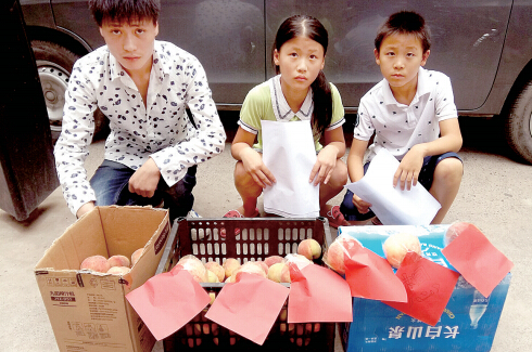 12日9時(shí)許,西三環(huán)建設(shè)路口東南角,一箱箱桃子從面包車上搬下,陳國西和兒子陳揚(yáng)細(xì)心地將“媽媽兒子想你”6張紅紙貼在桃子上。