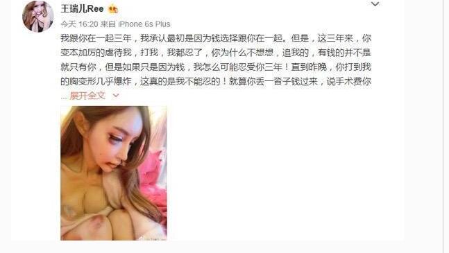 近日,曾有“第一網(wǎng)紅”之稱的嫩模王瑞兒在微博發(fā)文自曝被男友嚴(yán)重家暴,她大膽曬出右眼紅腫不堪、嘴角流血的“被虐打”慘狀,并稱胸被打到“變形幾乎爆炸”,和劉梓晨神似龍鳳胎。據(jù)稱,王瑞兒整容過的假胸價(jià)值高達(dá)百萬。王瑞兒自稱與男友交往三年,大方承認(rèn)最初在一起是貪圖對方“有錢”,三年來遭受了無休止的虐待和毆打,此次更是變本加厲險(xiǎn)些將胸“打爆”,這才怒而提出分手:“請你滾蛋,從此遠(yuǎn)離我的生活……如果再跟你在一起,我將萬劫不復(fù)!”
