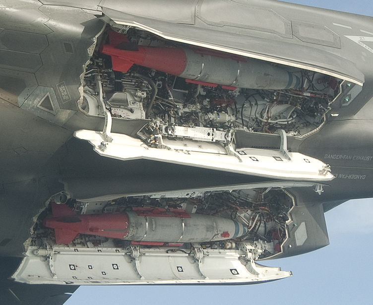 3月2日,美國洛-馬公司生產(chǎn)的F-35B BF-03試驗(yàn)機(jī)加掛兩枚JDAM制導(dǎo)炸彈升空試飛。試飛過程中,F(xiàn)-35B開啟隱藏式彈艙玩起橫滾機(jī)動(dòng)。圖為-35B BF-03隱藏式彈艙細(xì)節(jié)。